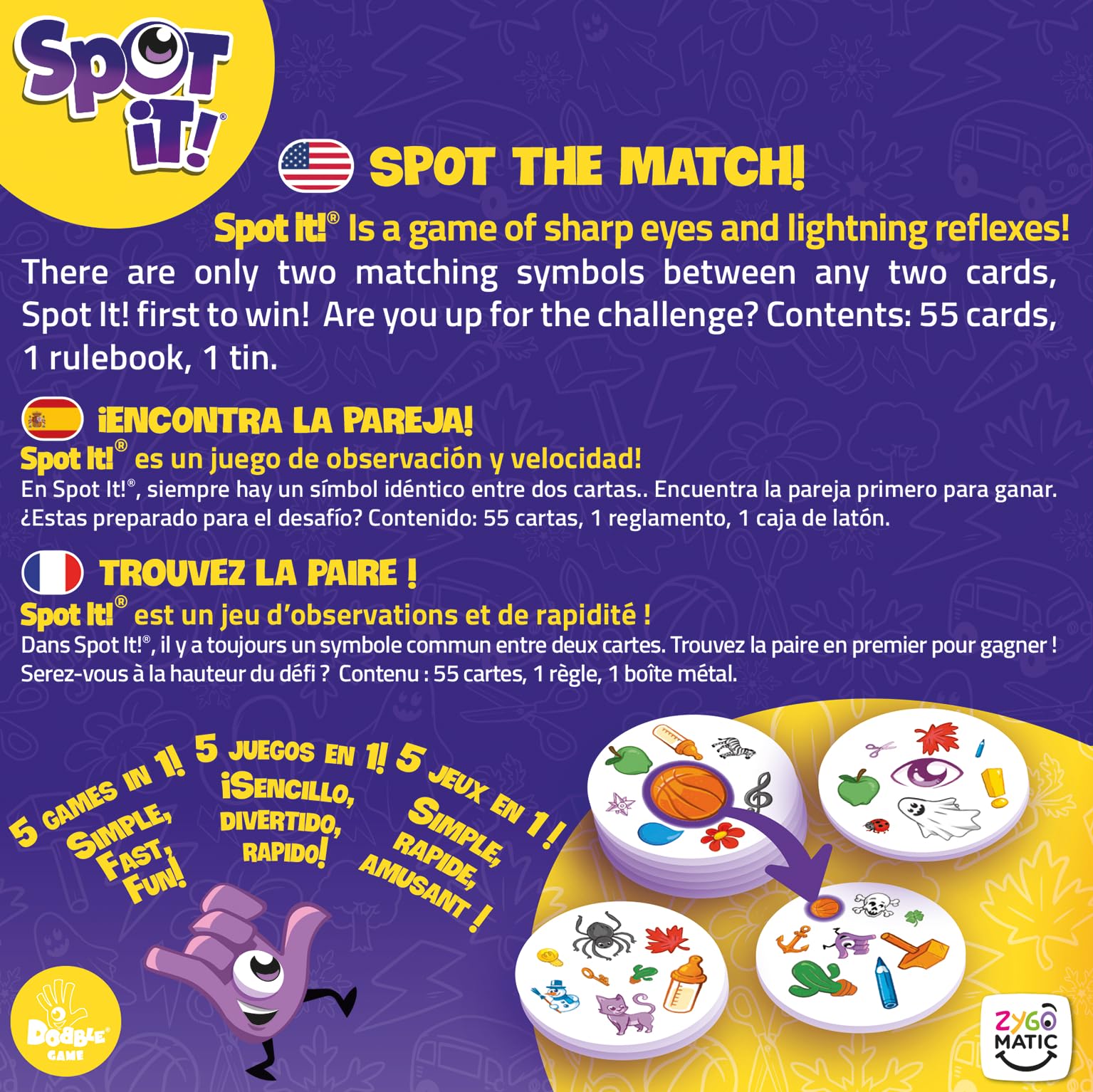 - LIGHTNING-FAST MATCHING GAME: Challenge your observational skills and lightning reflexes with Spot It!, where players race to spot the only matching symbol between any two cards.