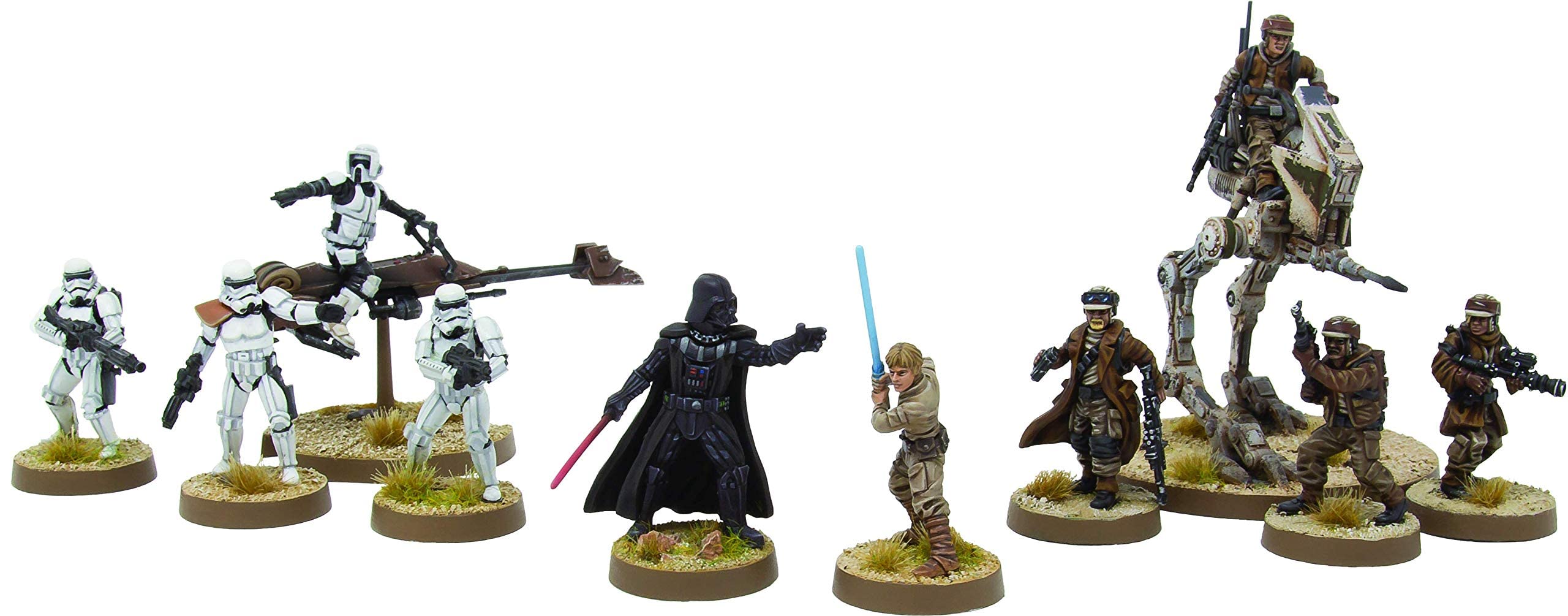 - INCLUDES LUKE SKYWALKER AND DARTH VADER: Each of these iconic Star Wars characters pose with lightsabers drawn, ready to duel each other or anyone unlucky enough to cross their path. These miniatures are found exclusively in the Core Set.